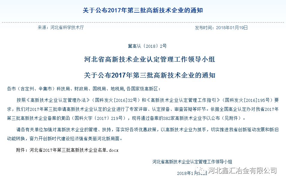 2018119日,经河北省高新技术企业认定管理办公室组织专家评审、公示等程序后,我公司顺利通过国家高新技术企业认定,成为高新技术企业。